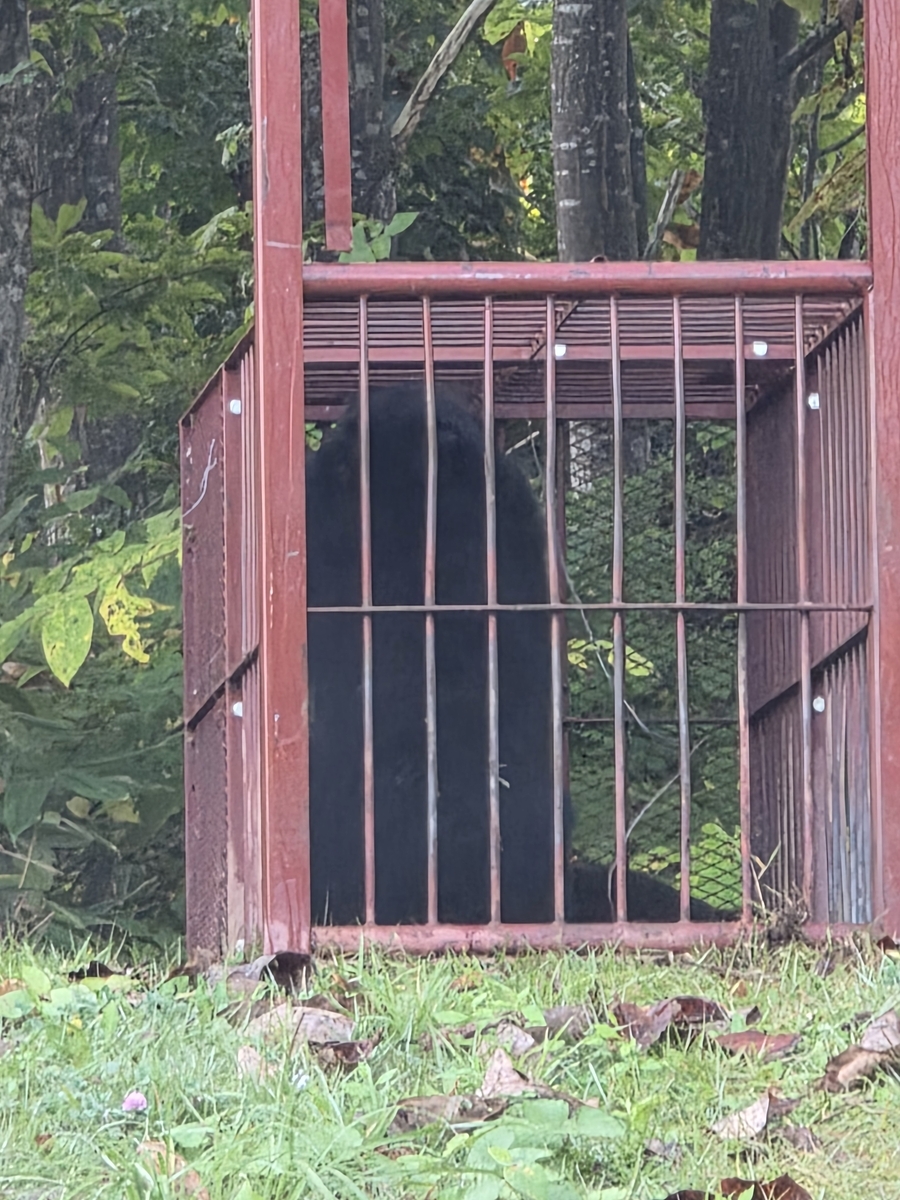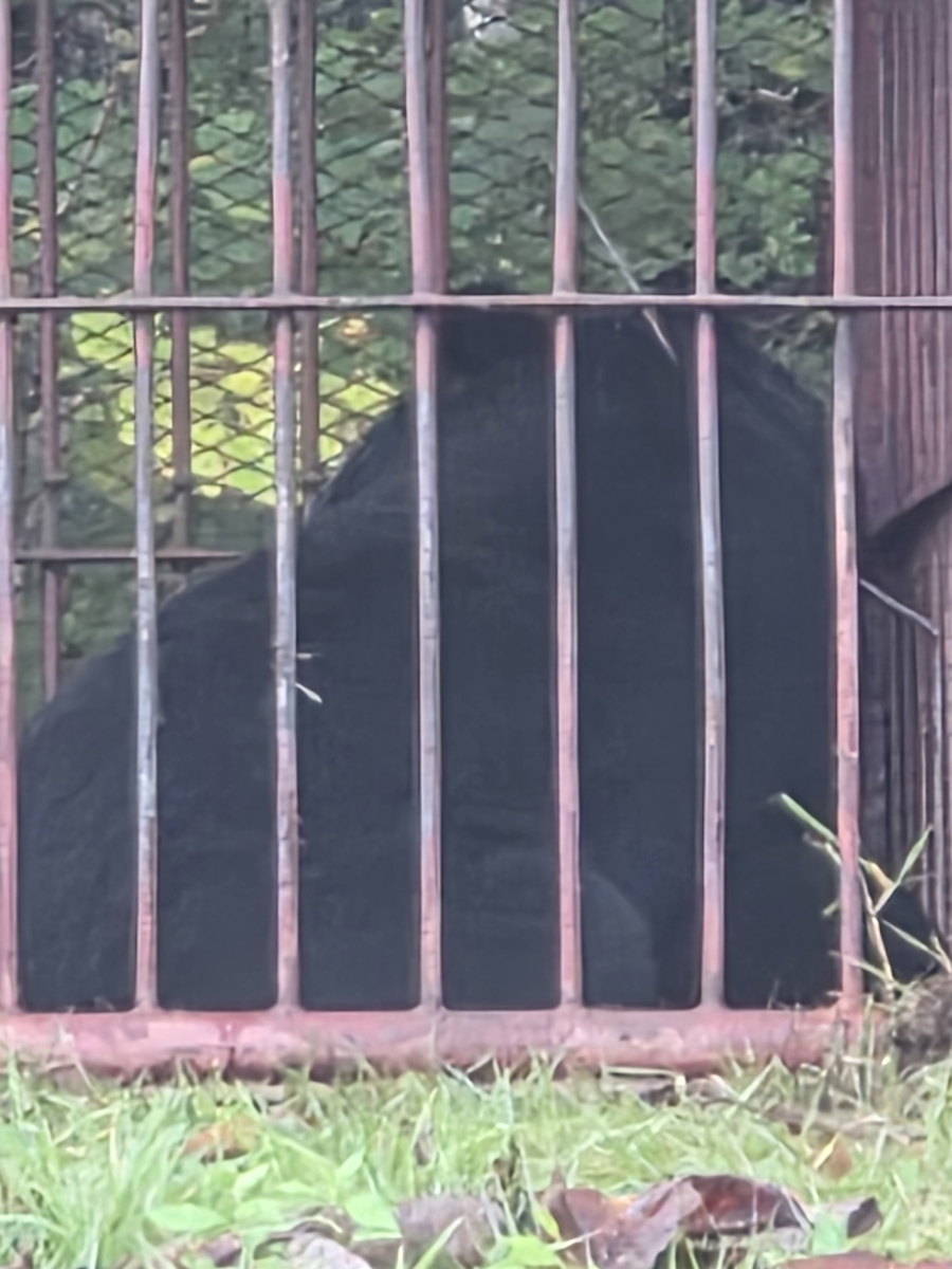 「お墓の方から降りてきて山に入って行った」そうです。10月7~8日頃だったでしょうか。その後、お墓の脇の栗の木で30分は栗の実を食べていたとか、親と子もいたようだとか。話を聞いて数日後には捕獲用の檻が設置され、15日にはこうなっていました。